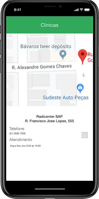 - Acesse os dados da clínica, como telefone e localização.