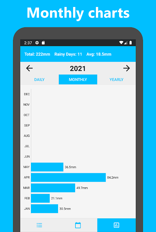 রেইন ট্র্যাকার আপনার পরিমাপের উপর ভিত্তি করে দৈনিক, মাসিক এবং বার্ষিক চার্ট তৈরি করবে।