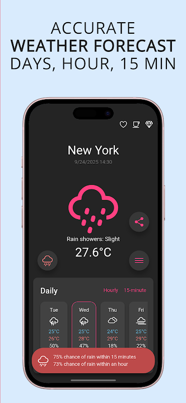 আর কখনও বৃষ্টিতে আটকা পড়বেন না। বৃষ্টি হবে?! প্রথম ফোঁটা পড়ার আগেই আপনাকে স্মার্ট বৃষ্টির সতর্কতা এবং বিজ্ঞপ্তি দেয়। মিনিট এবং ঘন্টার পূর্বাভাস পরীক্ষা করুন, আপনার প্রিয় জায়গাগুলির জন্য ব্যক্তিগতকৃত অ্যালার্ম সেট করুন এবং আত্মবিশ্বাসের সাথে আপনার দিন পরিকল্পনা করুন।