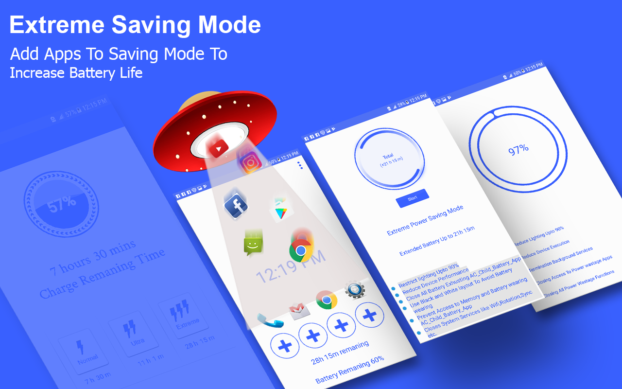- Advanced battery saver that effectively stops battery draining apps in the background;