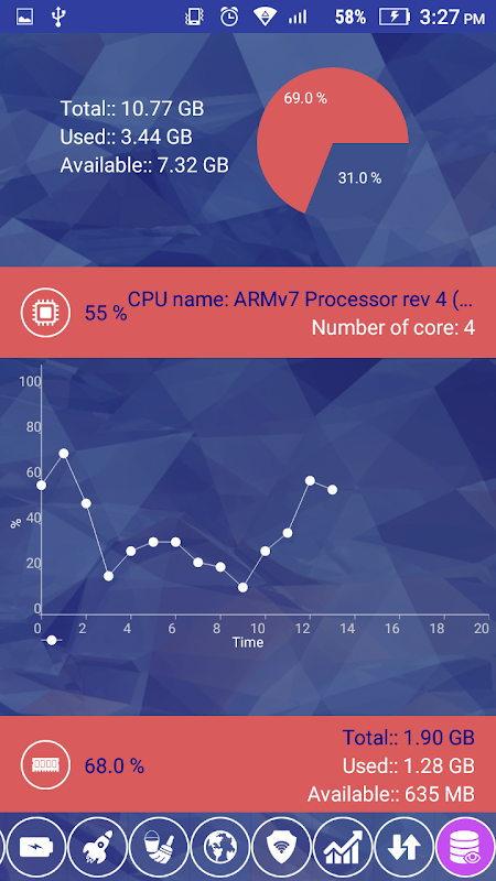 App display has 3 titles: Home shows status of SD cards & RAM ; List of running applications and programs with CPU usage; List of apps on the device with memory usage and uninstall option. Whenever you feel you need to speed up your phone, press “ Boost/b>” button to optimize its performance.