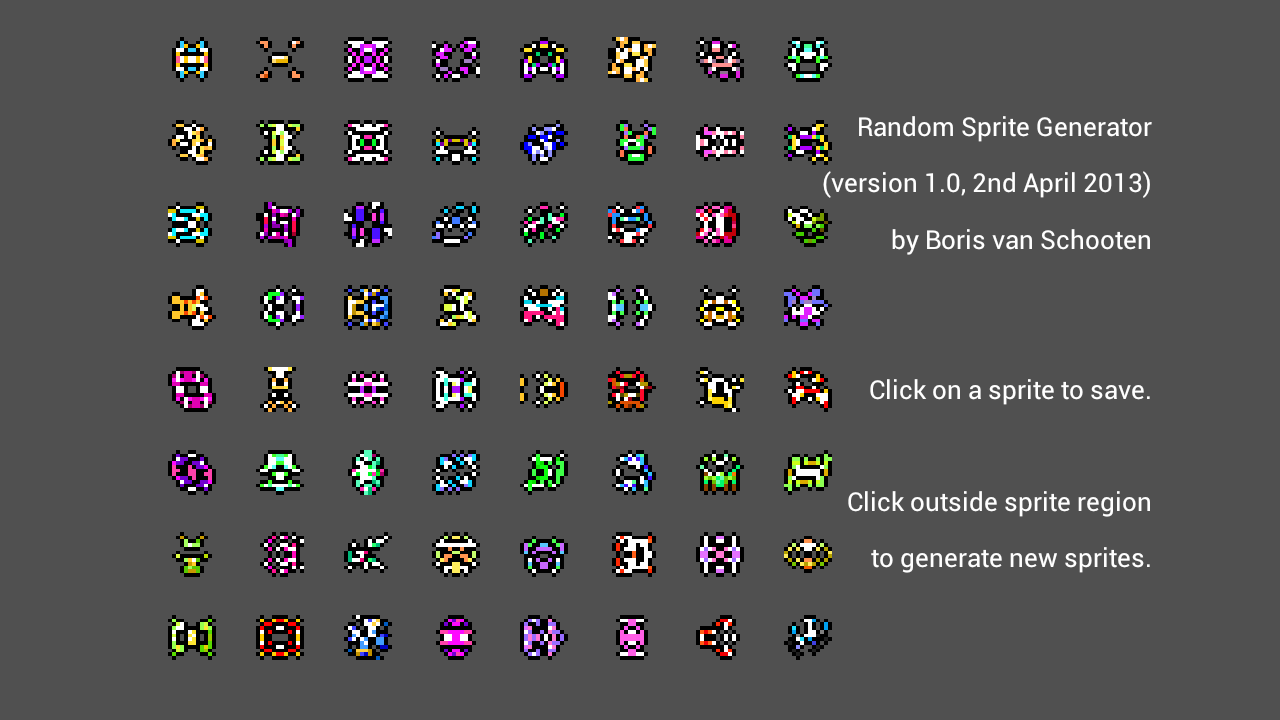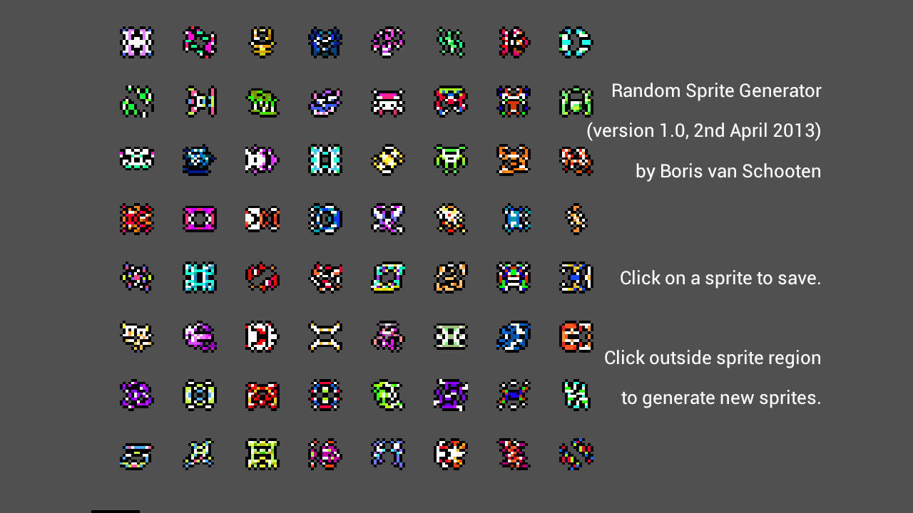 A random sprite generator I use for creating games. It generates 12x12 pixel animated retro style game sprites. Now on Android, which makes it possible to create game sprites anytime anywhere!