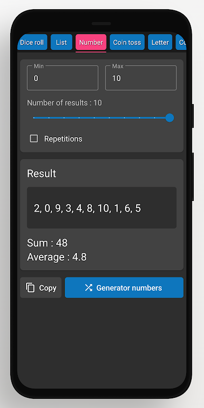 র্যান্ডম জেনারেটর একটি সহজ এবং সহজ অ্যাপ যা ডাইস রোল, র্যান্ডম সিলেকশন ফর্ম লিস্ট, এলোমেলো সংখ্যা, কয়েন ফ্লিপ, অক্ষর, রঙ, এলোমেলো পাসওয়ার্ড, দেশ, তারিখ এবং সময় তৈরি এবং বের করতে পারে।