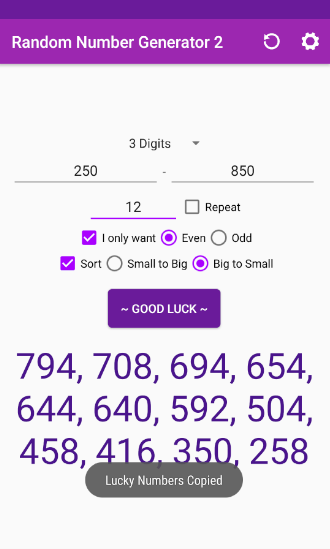 For example, you want to generate any number from 1000 to 9999, then you just select 4 digits and press Good Luck. Simple and fast.