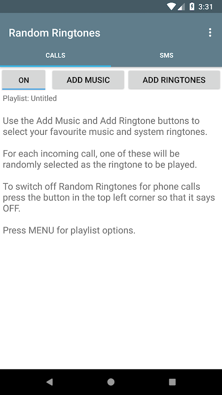 ইনকামিং কল এবং টেক্সট বার্তা জন্য আপনার রিংটোন Randomize. প্লেলিস্ট তৈরি করুন এবং কল বা এসএমএস হয় তাদের দায়িত্ব অর্পণ করা. একটা কল অথবা টেক্সট বার্তা আসে যখন একটি র্যান্ডম নির্বাচন নির্ধারিত প্লেলিস্ট থেকে তৈরি করা হবে.