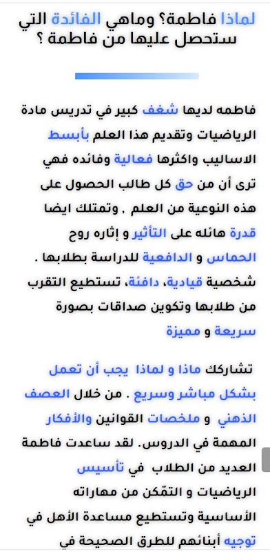 ভিডিও, শিক্ষামূলক প্রতিযোগিতা, এবং ইন্টারেক্টিভ মূল্যায়ন কার্যপত্রের মাধ্যমে উপস্থাপন করা হয়েছে "শিক্ষার্থীর পাঠে দক্ষতা নিশ্চিত করার জন্য", ফিনিশ অভিজ্ঞতা দ্বারা অনুপ্রাণিত, শিক্ষার্থীর স্বাস্থ্যকর এবং অধ্যয়নের শৈলী এবং অভ্যাসের জন্য একটি উন্নয়নমূলক প্রোগ্রামের সাথে সামঞ্জস্যপূর্ণ যা ছাত্রের মনকে ইতিবাচকভাবে প্রভাবিত করে এবং ব্যক্তিত্ব, এবং তারপরে সর্বাধিক ব্যাখ্যা করুন এবং গণিতের বোধগম্যতাকে পরবর্তী গ্রেডে একটি স্থায়ী এবং সহায়ক দক্ষতায় রূপান্তর করুন শিক্ষার্থীর জন্য দ্রুততম এবং সবচেয়ে আনন্দদায়ক সময়ে এবং অভিভাবকদের জন্য সর্বনিম্ন প্রচেষ্টা এবং খরচে