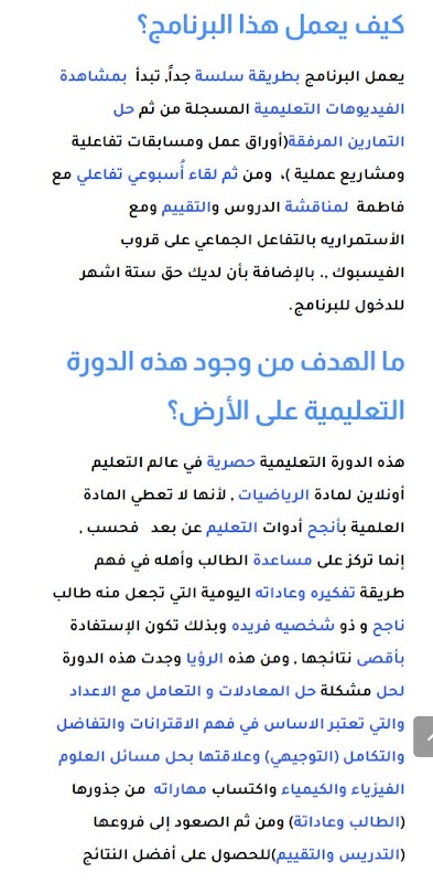 এই শিক্ষামূলক কোর্সটি গণিতের জন্য অনলাইন শিক্ষার জগতে একচেটিয়া, কারণ এটি কেবলমাত্র সবচেয়ে সফল দূরত্ব শিক্ষার সরঞ্জামগুলির সাথে বৈজ্ঞানিক উপাদান দেয় না, তবে ছাত্র এবং তার পরিবারকে তার চিন্তাভাবনা এবং তার দৈনন্দিন অভ্যাসগুলি বুঝতে সাহায্য করার দিকেও মনোযোগ দেয়। তাকে একটি অনন্য ব্যক্তিত্বের সাথে একজন সফল ছাত্র হিসাবে গড়ে তুলুন, এইভাবে এর সর্বাধিক ফলাফল থেকে উপকৃত হন। এই দৃষ্টিভঙ্গি থেকে, আমি সমীকরণ সমাধান এবং সংখ্যার সাথে কাজ করার সমস্যা সমাধানের জন্য এই কোর্সটি খুঁজে পেয়েছি, যা ফাংশন এবং ক্যালকুলাস (গাইডিং) বোঝার ভিত্তি এবং পদার্থবিদ্যা এবং রসায়নের সমস্যা সমাধানের সাথে এর সম্পর্ক এবং এর শিকড় (ছাত্র এবং অভ্যাস) থেকে এর দক্ষতা অর্জন এবং তারপরে সর্বোত্তম ফলাফল পাওয়ার জন্য এর শাখায় (শিক্ষাদান ও মূল্যায়ন) আরোহণ।