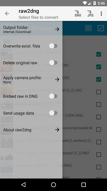 - ফোন ক্যামেরা দিয়ে নেওয়া ডিএনজি-ছবিগুলি হ্রাসহীনভাবে কম্প্রেস করার জন্য DNG-to-DNG রূপান্তরকে সমর্থন করে (উদাঃ, স্যামসাং এর S6 এবং S7 এ ~ 60% দ্বারা)
