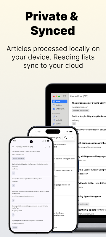 আপনার পড়ার ডেটা আপনার ডিভাইসে থাকে। কোনও সার্ভার আপনার নিবন্ধগুলি প্রক্রিয়া করছে না। রিডারফ্লো এমন একটি ব্যক্তিগত পাঠক যারা ডিজিটাল গোপনীয়তাকে মূল্য দেয়।