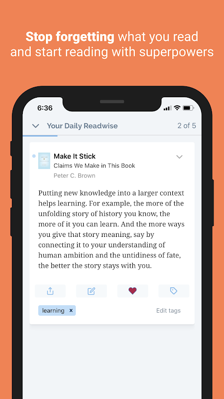স্পেসড রিপিটেশন এবং অ্যাক্টিভ রিক্যাল নামে পরিচিত বৈজ্ঞানিকভাবে প্রমাণিত শেখার কৌশলগুলি ব্যবহার করে রিডওয়াইজ এই সমস্যাটি সমাধান করে। প্রতিদিনের ইমেল এবং একটি অ্যাপ্লিকেশন ব্যবহার করে রিডওয়াইস সঠিক সময়ে ডান হাইলাইটগুলি পুনরায় উত্সাহ দেয়। রিডওয়াইস এমনকি যুক্ত করে রাখার জন্য আপনার সেরা হাইলাইটগুলি ফ্ল্যাশকার্ডে রূপান্তর করা সম্ভব করে তোলে।