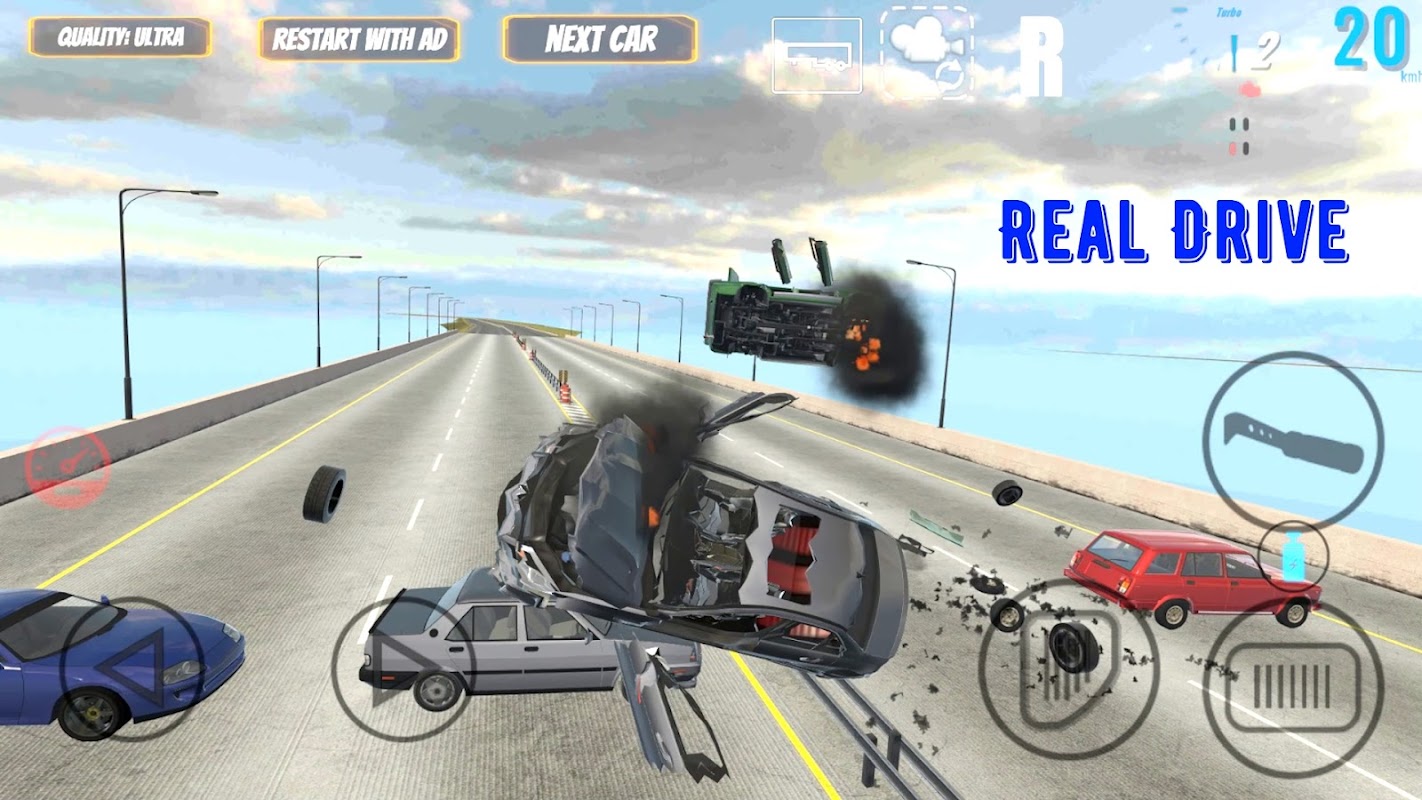 হিট্টাইট গেমস, কার ক্র্যাশ সিমুলেটর এবং কার ক্র্যাশ গেম সিরিজের স্রষ্টা, গর্বের সাথে আপনার কাছে রিয়েল ড্রাইভ উপস্থাপন করে। রিয়েল ড্রাইভে, আপনি একটি পাহাড়ি গ্রামাঞ্চলে গাড়ি চালাতে পারেন বা প্রধান মহাসড়কে বাস্তবসম্মত গাড়ি দুর্ঘটনা ঘটাতে পারেন। রিয়েল ড্রাইভে, সমস্ত গাড়ি প্রথম প্লে-থ্রুতে প্রস্তুত এবং আপনি কোনও লক ছাড়াই গেমটিতে পুরো রিয়েল ড্রাইভের উন্মুক্ত বিশ্বটি অন্বেষণ করতে পারেন। রিয়েল ড্রাইভে কোন নিয়ম এবং সীমা নেই। আপনি আপনার ইচ্ছামতো 19টি ভিন্ন যানবাহন চালাতে পারেন এবং বাস্তবসম্মত ক্ষতি সহ একটি গাড়ি ক্রাশ করতে পারেন। রিয়েল ড্রাইভে একমাত্র সীমা হল আপনার কল্পনা। গেমটিতে খোলা বিশ্ব অন্বেষণ করতে ভুলবেন না। উপভোগ করুন...