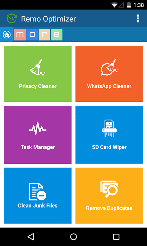 Remo অপ্টিমাইজার পরিচালনা অধিক 15 বৈশিষ্ট্য গঠিত, অপ্টিমিজ, উদ্ধার এবং আপনার অ্যান্ড্রয়েড স্মার্টফোনের এবং ট্যাবলেট উন্নত. এটা জাঙ্ক ফাইল পরিষ্কার ব্রাউজার সমস্যা সমাধানের জন্য "এক ক্লিক রক্ষণাবেক্ষণ" বিকল্প প্রস্তাব এবং মাত্র একটি ক্লিকের সঙ্গে, আপনার অ্যান্ড্রয়েড ডিভাইসের গতি boosts. এটা ভাল ব্যবহারকারীর অভিজ্ঞতা জন্য সহজ মেট্রো স্টাইল UI 'নকশা সঙ্গে আসে.