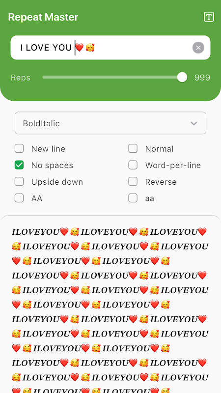 টেক্সট রিপিটার - কাস্টমাইজযোগ্য বিকল্পগুলির সাথে অবিলম্বে পুনরাবৃত্তি পাঠ্য তৈরি করুন।