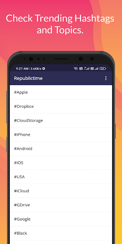 রিপাবলিকটাইম টেক নিউজ / প্রবন্ধ, ভ্রমণ, স্বাস্থ্য সংবাদ / প্রবন্ধ, ব্যবসা, স্টার্টআপ নিউজ / প্রবন্ধ, লাইফস্টাইল, ভারত, মার্কিন যুক্তরাষ্ট্র, এবং বিশ্ব সংবাদ / নিবন্ধের মতো বিশাল সংখ্যক বিভাগ অফার করে এক অ্যাপে। এবং রিপাবলিকটাইম আপনার আপডেট এবং অবগত থাকার জন্য সেরা অ্যাপ। আপনি বাম এবং ডানদিকে সোয়াইপ করে বিভিন্ন প্রবণতা বিষয়ের কাছাকাছি যেতে পারেন।