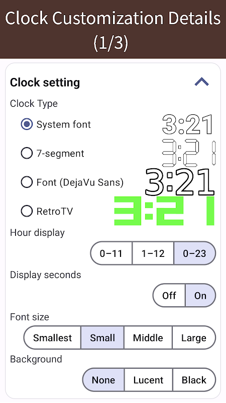 সেটিংসে, আপনি ফন্ট, আকার, প্রদর্শনের অবস্থান এবং ঘড়ির পটভূমি সেট করতে পারেন।