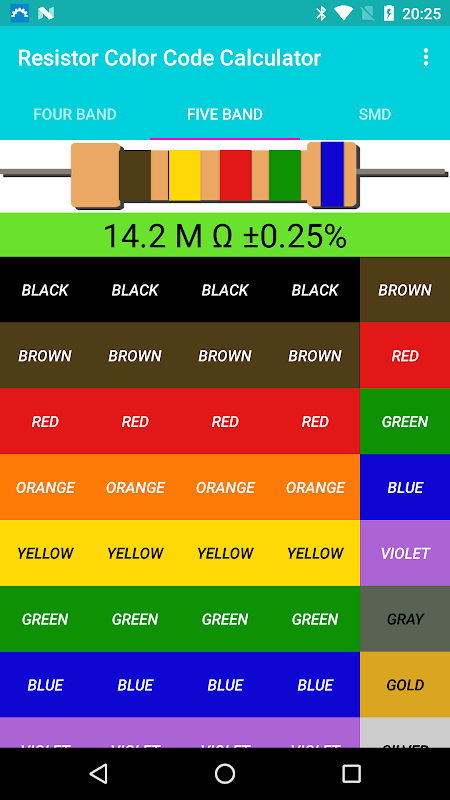 এই অ্যাপ্লিকেশান থেকে আপনি 4 ব্যান্ড এবং সহনশীলতা মান 5 ব্যান্ড রোধ রঙের কোড এর মান জানতে পারেন এবং 3 অঙ্ক, 4 অঙ্ক এবং ইআইএ-96 মান SMD ও রোধ কোড মান পাবেন। এই অ্যাপ্লিকেশন বিশেষভাবে যখন electronics.This অ্যাপ্লিকেশন সঙ্গে কাজ যখন আপনি ইলেকট্রনিক্স প্রকল্প এবং ইলেকট্রনিক্স পরীক্ষার সাথে কাজ করেন, সহায়ক হতে পারে প্রকৌশলী, ছাত্র, ইলেকট্রনিক্স পরীক্ষক এবং Arduino বা ফলবিশেষ Pi উত্সাহী জন্য উন্নত। [email protected]: আপনি এই অ্যাপ্লিকেশন সংক্রান্ত কোন পরামর্শ থাকে, তাহলে এই ইমেইল আইডি আমার মেইল করুন মুক্ত মনে। আমি আমার যথাসাধ্য চেষ্টা করতে হবে।