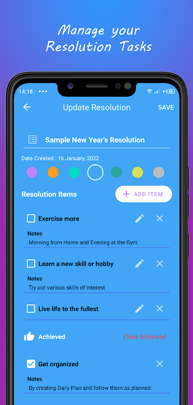 রেজোলিউশন ডায়েরি হল একটি দূরদর্শী ডিজিটাল ডায়েরি যা আপনাকে আপনার অর্জিত এবং অপ্রাপ্ত লক্ষ্যগুলির ট্র্যাক রাখার লক্ষ্যে বিভিন্ন রঙের সাথে স্টাইল করা ব্যক্তিগত রেজোলিউশন বা লক্ষ্যগুলি নোট করতে সক্ষম করে।