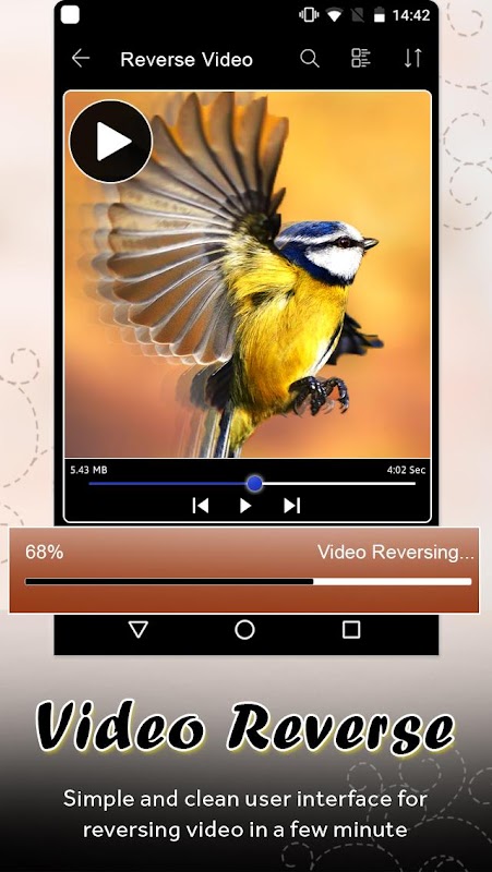 আবেদন একটি নতুন ভিডিও যে ফাইলটি মূল ফিল্ম বাজানো পিছন পুনর্গঠন করা হবে তৈরি করবে। একটি উল্টানো ভিডিও তৈরি করে খুব সৃষ্টিশীল এবং মজার ছায়াছবি তৈরি করুন।