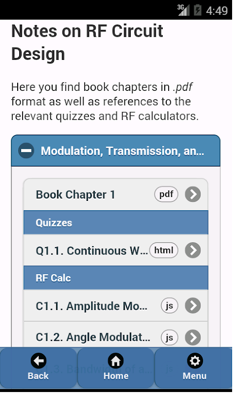 The App also contains short summaries on RF and microwave circuits as well as a free book on RF circuit design with the following chapters: