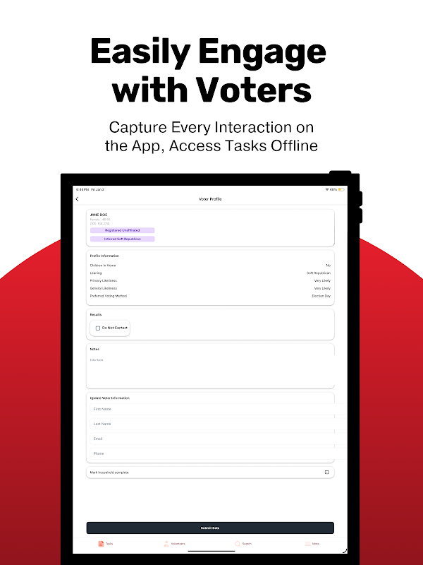 সহজ মানচিত্র-ভিত্তিক প্রচারণা এবং ফোন ব্যাংকিং সরঞ্জামের মাধ্যমে, এমনকি আপনার সবচেয়ে কম প্রযুক্তি-বুদ্ধিমান স্বেচ্ছাসেবকরাও সহজেই কাজ করতে পারবেন। যখন আপনি আমাদের অ্যাপটিকে আমাদের বিশ্বমানের CRM-এর সাথে একত্রিত করেন, তখন আপনার কাছে রিয়েল-টাইম তথ্যের অ্যাক্সেস থাকে যা আপনাকে আপনার কৌশল পরিকল্পনা করতে এবং প্রতিটি ভোটারের অবস্থা ট্র্যাক করতে সহায়তা করে। আপনি নির্দিষ্ট মানদণ্ডের উপর ভিত্তি করে একজন ব্যক্তির জন্য পদক্ষেপগুলিকে গতিশীলভাবে সামঞ্জস্য করতে পারেন।