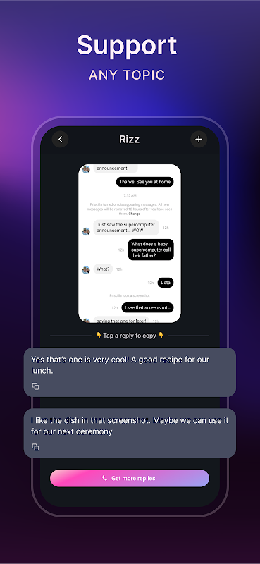 ব্যক্তিগতকৃত প্রতিক্রিয়া: RizzGPT আপনার যোগাযোগের শৈলীর সাথে খাপ খায়, আপনার মিথস্ক্রিয়া থেকে শিখে প্রতিক্রিয়া তৈরি করে যা আপনার স্বর, রসবোধ এবং শব্দভাণ্ডারকে প্রতিফলিত করে। আপনি যত বেশি RizzGPT ব্যবহার করবেন, এটি আপনার নিখুঁত AI ডেটিং সহকারী হিসাবে তত ভাল হবে।