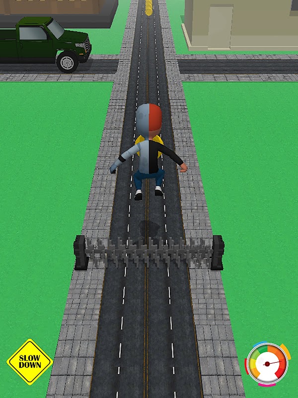 The runner is in your control. You can speed up the runner or slow it down, depends on what's ahead to avoid. There are road blocks, moving cars, trucks, vans, even taxies. There are no stop lights on the crossroads, so you better jump when a car is approaching, slow down or speed up.
