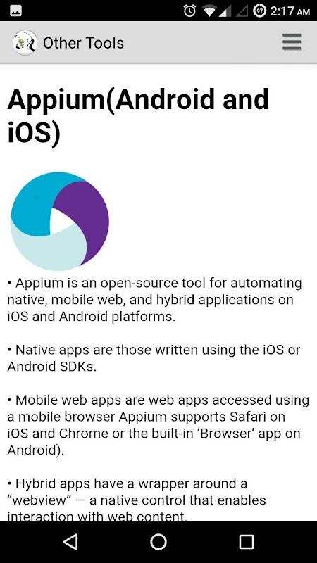 Robotium is similar to Selenium, but for Android. It has support for Android features such as activities, toasts, menus and context menus.