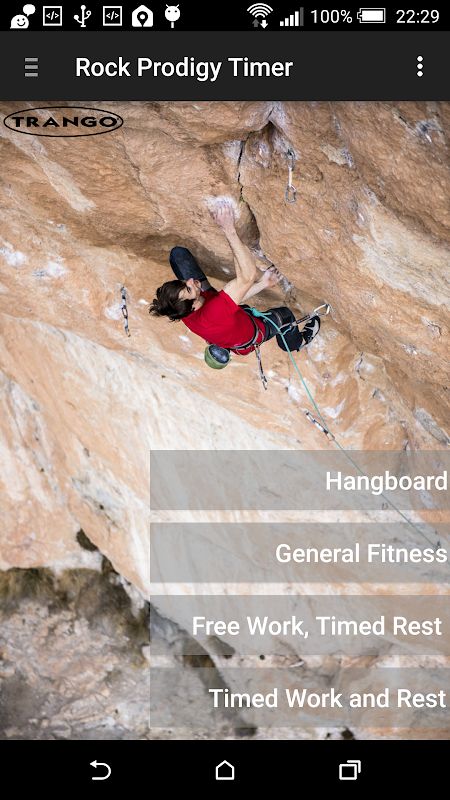 Trango আরোহণ করে এই অ্যাপ্লিকেশন পর্বতারোহীকে এর প্রশিক্ষণ ম্যানুয়াল প্রোটোকল এবং hangboards এর রক দৈত্য সিরিজের উপর ভিত্তি করে Workout টাইমার উপলব্ধ করা হয়: