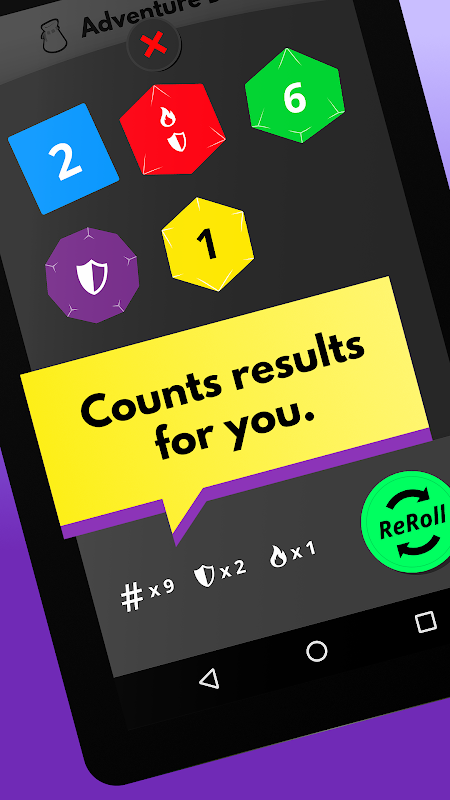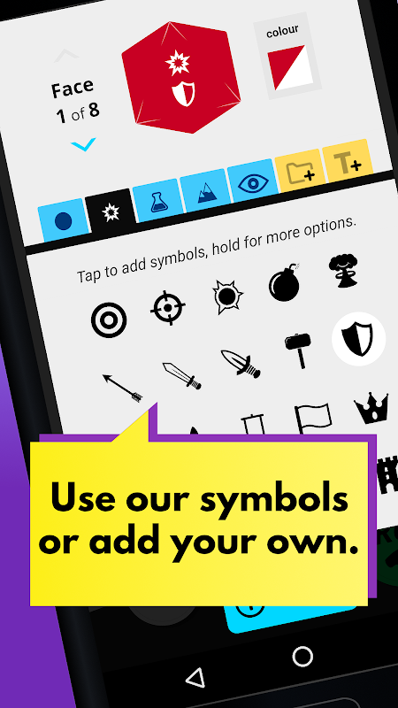 সেকেন্ডের মধ্যে যেকোনো ডাইস তৈরি করুন এবং রোল করুন: 5টি বিভাগ থেকে প্রতীক ব্যবহার করুন বা আপনার নিজের ছবি এবং পাঠ্য আমদানি করুন। Yahtzee এবং Backgammon থেকে D&D এবং Star Wars X-Wing পর্যন্ত, আপনার সংগ্রহে বা আপনার কল্পনার যেকোনো গেমের জন্য পাশা রোল করুন।