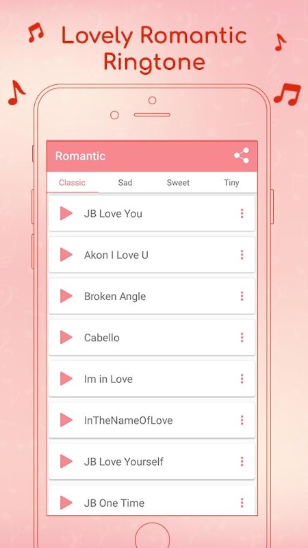 Romantic Ringtone app is the great collection of popular lovely romantic songs and music as unique 60+ Love Ringtones which you can use as ringtone, notification, alarm, or assign to a contact and much more.