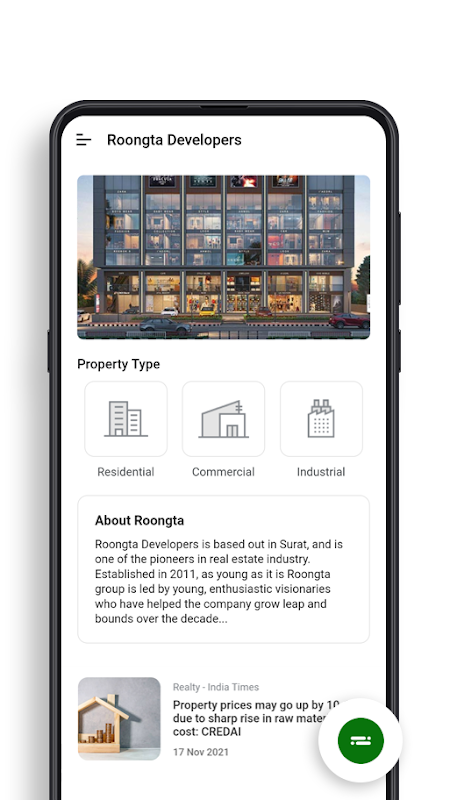 Roongta Developers হল সুরাটের একটি প্রধান রিয়েল এস্টেট সংস্থা যা সাশ্রয়ী মূল্যে বিলাসবহুল সম্পত্তি অফার করে। উপরন্তু, আমাদের ব্যবহারকারী-বান্ধব অনুসন্ধান অ্যাপ আপনাকে আমাদের প্রকল্পগুলি সম্পর্কে জানতে দেয় যা আপনার পকেটে ফিট করার সময়ও আপনার চাহিদা পূরণ করে। আপনি আবাসিক অ্যাপার্টমেন্ট, বাণিজ্যিক দোকান বা একটি শিল্প প্রকল্প খুঁজছেন কিনা, আমাদের অ্যাপ আপনাকে কভার করেছে!