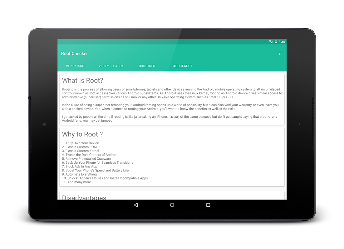This Root Checker provides a very simple way to check root on your device without messing up anything. It gives every info that one might need from a newbie user to an advanced user as well.