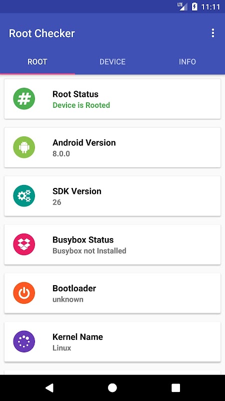 This application provide technical detailed related to root status (superuser access). Root checker app also provide device information like brand, model, imei, build, os version etc.