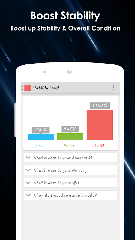 With Root Master's Stability Booster you can improve overall condition of your device in instant. Stability Booster give the perfect balance to your device's condition with improved battery life & speed. It forms the shield around your device to improve its condition so that every time you use your device it fells like new.