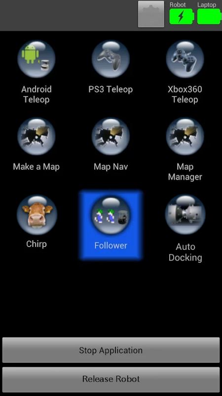 Once connected, remocon displays a list of the app pairs (robot and android) that you can start/stop remotely.