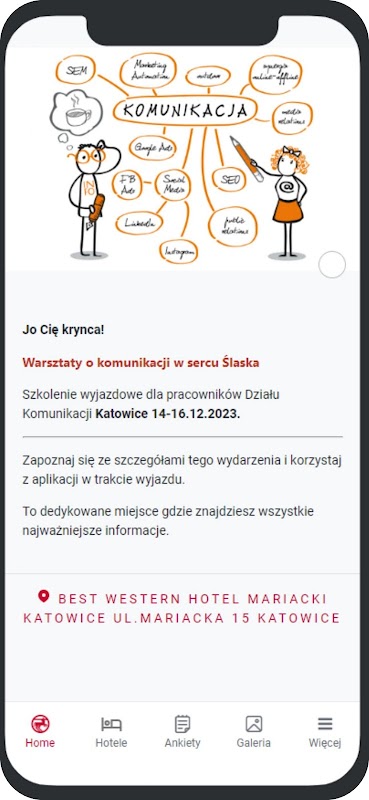 অ্যাপ্লিকেশনটির প্রধান অনুমানগুলি হল QR কোড স্ক্যান করার পরে এটির প্রাপ্যতা, লগ ইন করার পরে সামগ্রী অ্যাক্সেস করার ক্ষমতা, বিষয়বস্তু প্রশাসকের ভিডিও ফাইল যুক্ত করা, থাকার জায়গাগুলি নির্দেশ করার ক্ষমতা - হোটেল, মানচিত্রের মিটিং পয়েন্ট এবং স্যুইচ করার ক্ষমতা গুগল মানচিত্র.