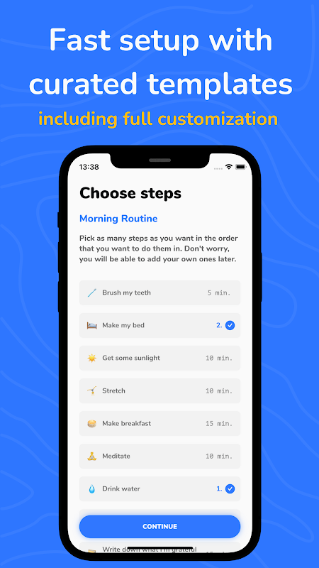 ADHD পরিচালনা বা অটিজম পরিচালনা করার জন্য একটি রুটিন তৈরি করার জন্য এই অ্যাপটি ব্যবহার করা শুরু করার সময়, সকালের রুটিন বা অধ্যয়নের রুটিনের মতো প্রচুর টেমপ্লেট উপলব্ধ রয়েছে৷ উপযোগী ADHD রুটিন ভবিষ্যতের জন্য পরিকল্পনা করা হয়। টেমপ্লেটগুলির মধ্যে একটি বেছে নিন বা একটি কাস্টম রুটিন তৈরি করে স্ক্র্যাচ থেকে শুরু করুন।