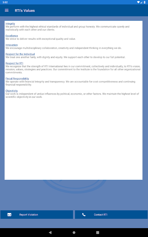 This tool is intended for RTI employees and business partners and provides quick, convenient access to our Ethics and Compliance core program. You will find access to our values, standards, Code of Conduct, policy summaries and more.