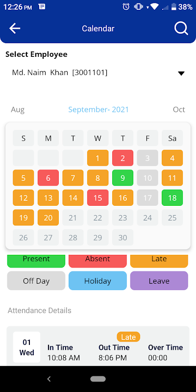 স্মার্ট অ্যাটেনডেন্স ক্যালেন্ডার - স্পষ্ট রঙের কোড সহ উপস্থিত, অনুপস্থিত, দেরী, ছুটি বা ছুটির অবস্থা ট্র্যাক করুন।