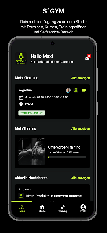 এই অ্যাপটির সাহায্যে আপনার একটি S'GYM সদস্য হিসাবে নিম্নলিখিত বিকল্পগুলি রয়েছে: