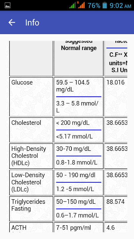 এবং প্রচলিত ইউনিট বা একক বা প্রচলিত ইউনিট বা ওজন পরিমাপ-সংক্রান্ত ইউনিট অথবা পরম্পরাগত ইউনিট (মিলিগ্রাম / ডেসীলিত্র mg / dL) থেকে গ্লুকোজ, কলেস্টেরল, বিলিরুবিন (mmol / লিটার) স্ট্যান্ডার্ড ইন্টারন্যাশনাল এসআই ইউনিট থেকে মত 29 বিভিন্ন বায়োকেমিক্যাল মান রূপান্তর করুন. এই ডায়াবিটিস, জীবরসায়নবিদ ইত্যাদি দৈনিক টাস্ক হয়