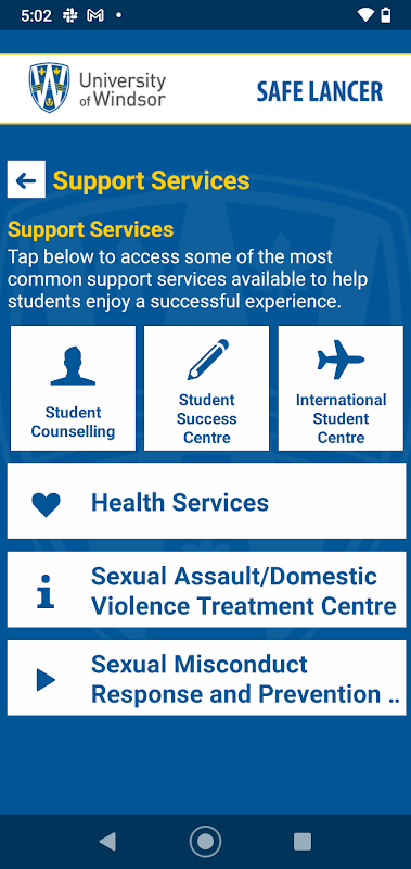 - ক্যাম্পাস নিরাপত্তা সম্পদ: অ্যাক্সেস এক সুবিধাজনক app এর মধ্যে সব গুরুত্বপূর্ণ বিশ্ববিদ্যালয় উইন্ডসর নিরাপত্তা সম্পদ.