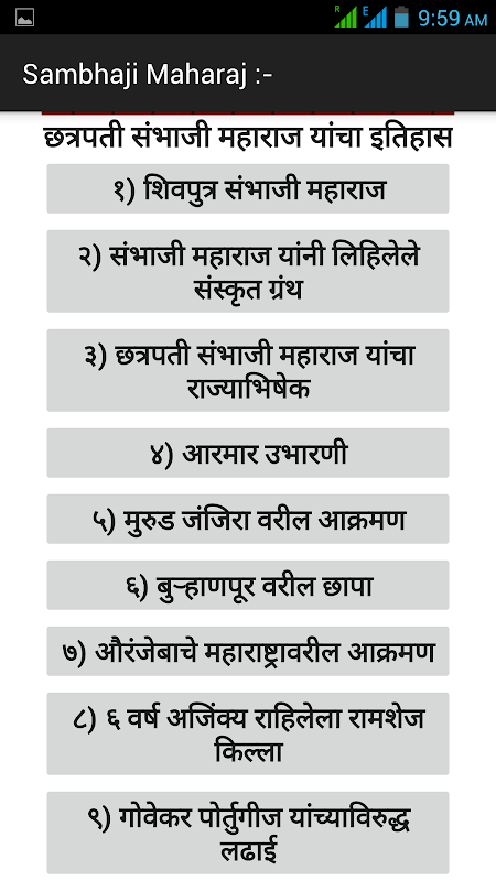 এই অ্যাপ্লিকেশন মারাঠি মধ্যে ছত্রপতি Sambhaji মহারাজের ইতিহাস রয়েছে.