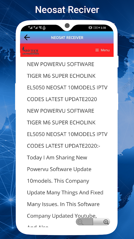 স্যাটেলাইট ডিশ রিসিভার সফ্টওয়্যারটি বিভিন্ন ধরণের বৈশিষ্ট্য যেমন তথ্য, সফ্টওয়্যার, স্টার ট্র্যাক, নিওস্যাট, সমস্ত চীন ব্র্যান্ড এবং অন্যান্য ব্র্যান্ডের রিসিভারগুলির মতো সর্বাধিক ব্যবহৃত রিসিভার সম্পর্কিত ফ্রিকোয়েন্সি অফার করে।
