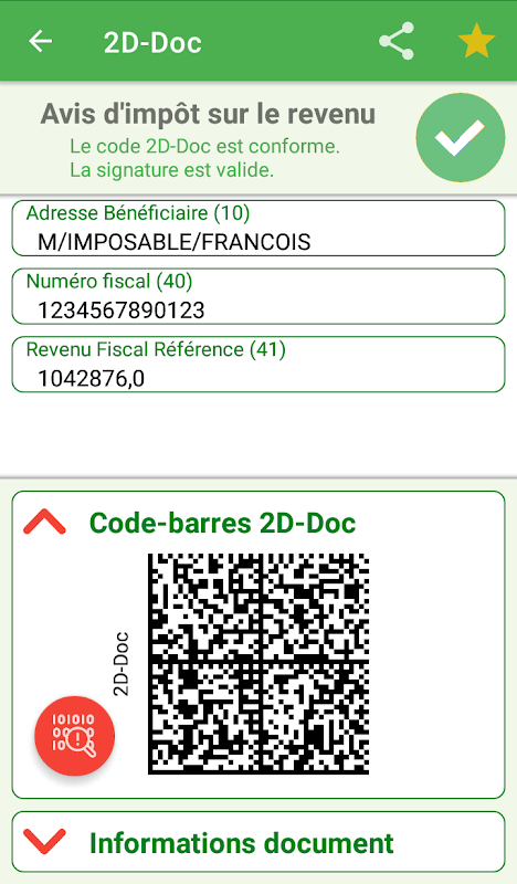 বর্তমানে, এই অ্যাপ্লিকেশনটি ANTS স্পেসিফিকেশন V3.2.6 (https://ants.gouv.fr/nos-missions/les-solutions-numeriques/2d-doc) এর সাথে সঙ্গতিপূর্ণ সমস্ত নথি পড়তে পারে সংস্করণে খুব বিরল কোড -bars ছাড়া 4 বাইনারি।