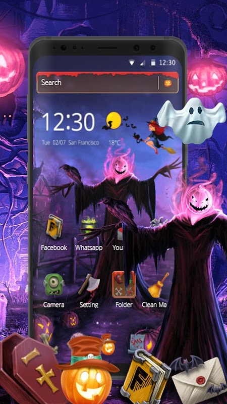 Scare Crow Pumpkin Halloween Theme is also compatible with different brands of phones like Samsung (Samsung Galaxy S7 Edge, Samsung Galaxy S6 Edge, Samsung Galaxy S5, Samsung Galaxy J7, Samsung Galaxy Note7), Huawei (Huawei P9, Huawei P8, Huawei Mate 9, Huawei Mate 8, Huawei Honor 8), Sony (Sony Xperia Z5, Sony Xperia Z4, Sony Xperia Z3, Sony Xperia XZ) and HTC (HTC 10, HTC One A9, HTC One X9, HTC Desire 10 Pro). Scare Crow Pumpkin Halloween Theme launcher theme is designed to let you enjoy night feeling, a faster and smoother mobile and dark operating experience.