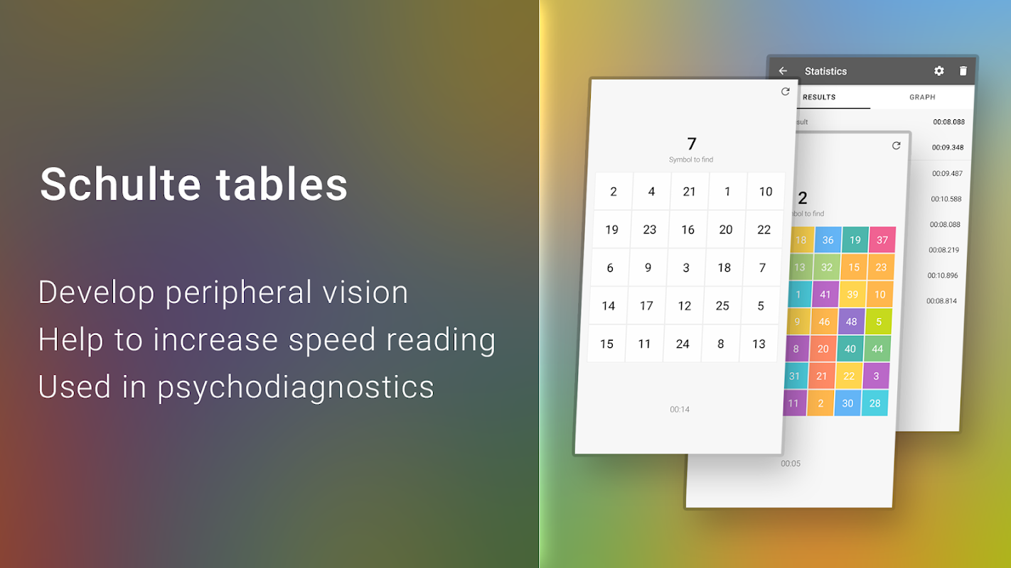 Schulte table - একটি দরকারী অ্যাপ্লিকেশন যা মনোযোগ, পেরিফেরাল দৃষ্টি, চাক্ষুষ উপলব্ধি প্রশিক্ষণে সহায়তা করে এবং ফলস্বরূপ, পাঠ্য এবং বই পড়ার গতি বাড়ায়। বিভিন্ন ডিজাইন শৈলীর কারণে, অ্যাপ্লিকেশনটি প্রাপ্তবয়স্কদের এবং শিশুদের জন্য উপযুক্ত।