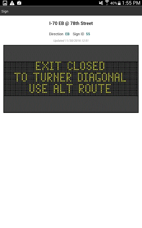 কানসাস সিটি স্কাউট ট্রাফিক অ্যাপ্লিকেশন পরিবহন এর ইন্টেলিজেন্ট পরিবহন সিস্টেম (এর) এর কানসাস সিটি স্কাউট এর থেকে কানসাস সিটি মেট্রো এলাকার রাস্তাঘাট জন্য তথ্য মোবাইল এক্সেস সঙ্গে যাত্রীদের এবং ভ্রমণকারীরা উপলব্ধ করা হয়. উপলব্ধ তথ্য অন্তর্ভুক্ত করা: