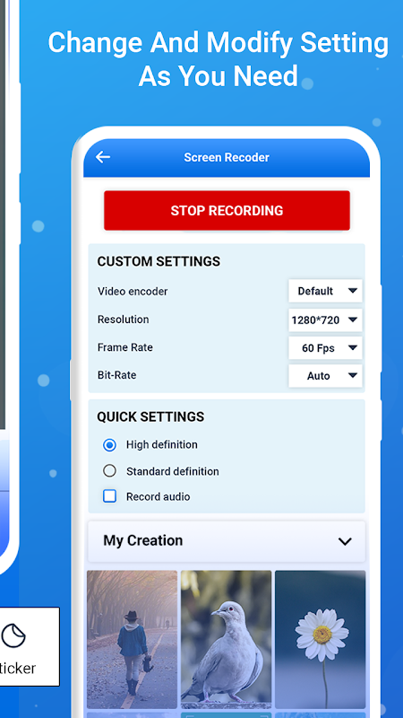স্ক্রিন রেকর্ডার আপনাকে আপনার স্ক্রীন এইচডি এবং ফুল এইচডি ভিডিওতে রেকর্ড করতে দেয়। আপনি মাইক থেকে অডিও রেকর্ড করতে পারেন এবং এটি স্বয়ংক্রিয়ভাবে ভিডিওগুলিতে মিশ্রিত হয়।