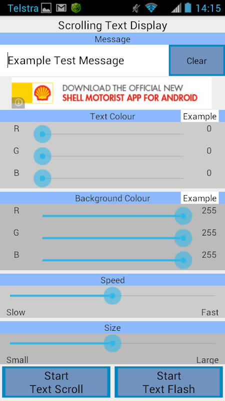 পর্দা জুড়ে আপনার টেক্সট স্ক্রল শুরু 'শুরু টেক্সট স্ক্রল' বাটন চাপুন. একটি সময়ে আপনার বার্তা এক শব্দ দেখাতে 'শুরু টেক্সট ফ্ল্যাশ' বাটন চাপুন.